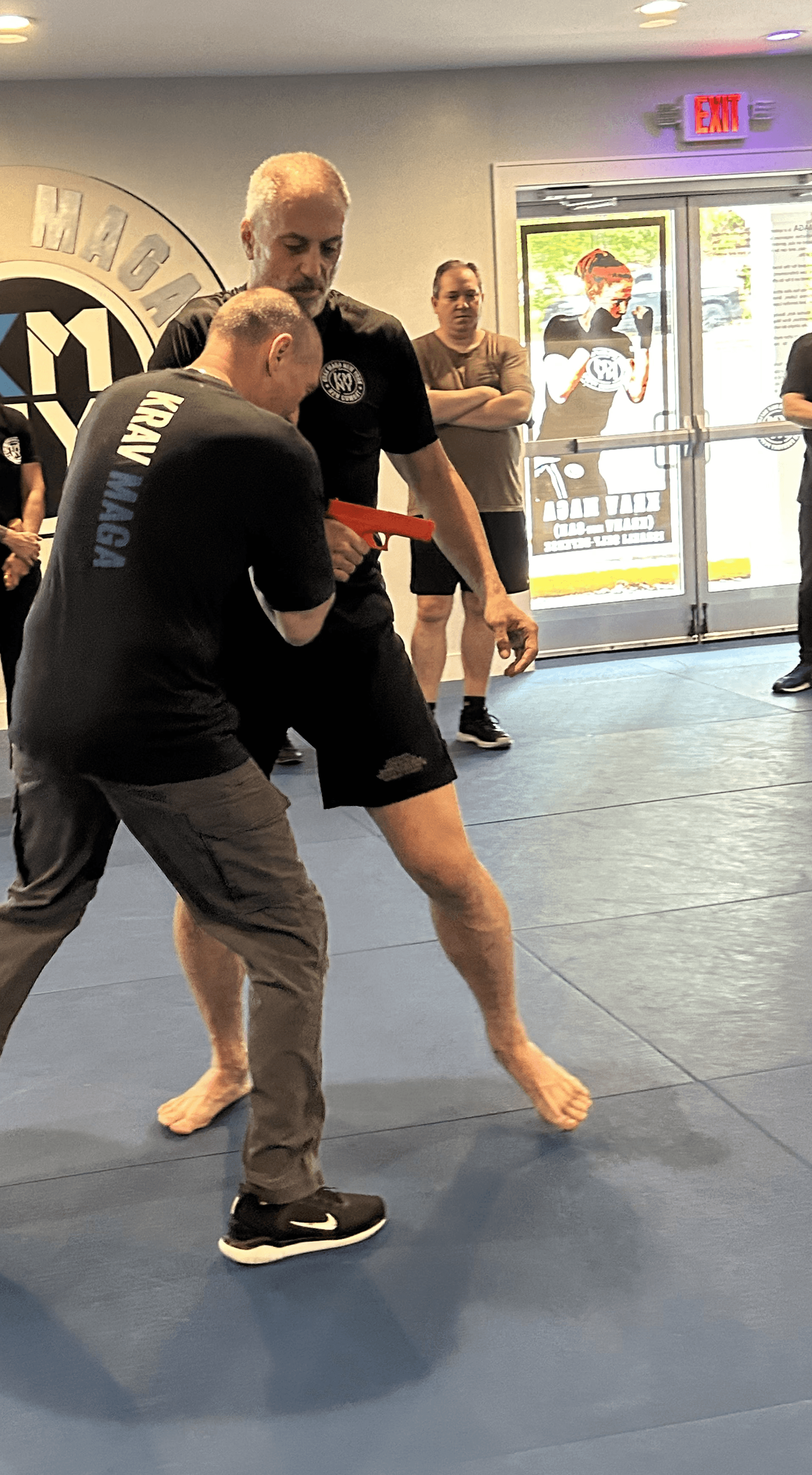 Grabbed from behind in a bear hug — you're out in two moves. Someone pins you to a wall — there's an immediate answer for that. Weapon threat at close range — Krav Maga has specific responses for that scenario that no other art trains as directly.